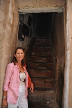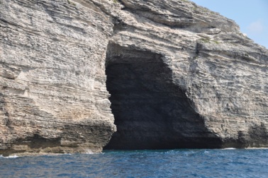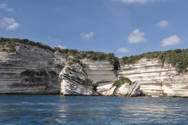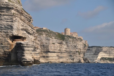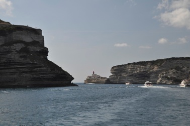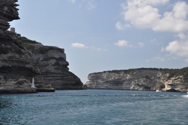 El puerto y la marina de Bonifacio están al fondo de lo que los franceses llaman una calanque .... Es literalmente una rajadura de la tierra entre los acantilados. Generálmente muy profunda y estrecha, flanqueada por empinados acantilados y su entrada es muy dificil de ver, incluso de día. Llegamos de noche a eso de las 21 horas, solo un farito rojo indicaba la entrada: uno navega de frente hacia el acantilado sientendo las olas rompiendo sin que se vea ninguna entrada. Pareciera que el velero se fuera a estrellar contra las rocas. Patricia, Aurelio y Chila se asustaron mucho al ver que yo enfilaba a “Natasha” hacia esa pared de roca !!!! .... pero a último momento apareció la estrecha entrada flanqueda por sus altos acantilados. De ahí en adelante el mar se calmó y entramos ya muy al fondo al puerto de la marina que es muy protegido. La ciudad antigua de Bonifacio está montada encima del acantilado, colgada de la roca como se ve en la foto de arriba (tomada desde afuera al salir).